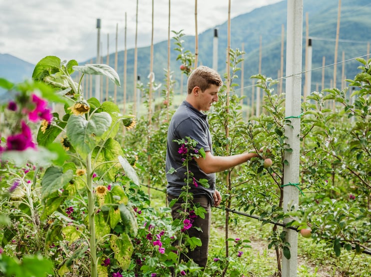 Wie lässt sich das Ökosystem nicht nur schützen, sondern nachhaltig fördern? Die Vinschger Bauern haben es über die Jahre gelernt: Sie bauen Trockenmauern und Insektenhotels, bieten Nistmöglichkeiten, legen Blühstreifen an und sorgen so in ihren Obstanlagen für genügend Rückzugs- und Lebensräume für Tiere und Pflanzen. Der Dank: reges Leben in den Obstgärten und genügend Nutztiere, die Schädlinge auf natürliche Art fernhalten. Wir arbeiten auch eng mit den Vinschger Imkern zusammen, um Projekte zum Bienenschutz umzusetzen. So haben wir zum Beispiel in Zusammenarbeit bereits mehrere Bienenweiden im Vinschgau errichtet oder fördern den bienenfreundlichen Anbau.