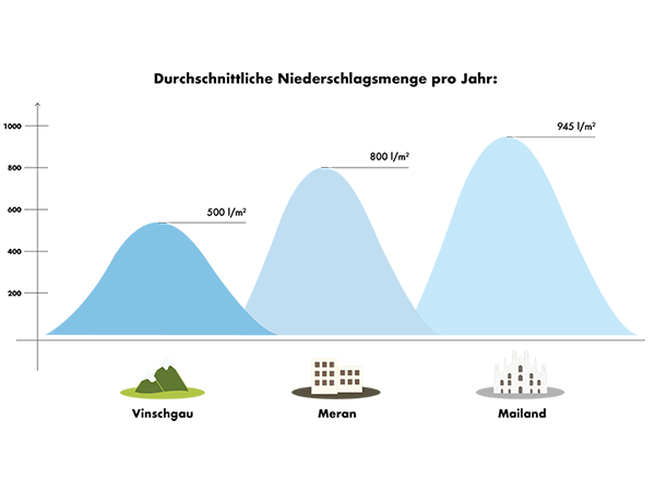 „Der trockene Vinschgau ist ein Tal von ca. 70 km Länge mit reiner West-Ostausrichtung. Vor allem im Norden riegeln sehr hohe Bergmassive das Tal von regenbringenden Wolken aus dieser Himmelsrichtung ab. Die potentiellen Durstlöscher kommen aufgrund der Bergmauern nicht ins Tal rein, sondern produzieren Föhnwind, der erst recht für Trockenheit sorgt. Bei uns fallen im Schnitt nur 500 l Niederschlag pro m² und Jahr. Im Vergleich dazu fallen im benachbarten Meran schon fast 800 l/m² und Meran befindet sich nur weniger Kilometer außerhalb des Vinschgaus.“