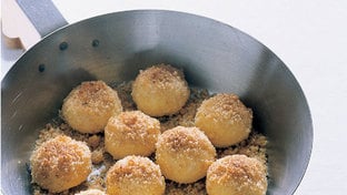 Terminación Cocer las bolitas en abundante agua ligeramente salada, dejándolos hervir suavemente a fuego bajo durante 10–15 minutos, hasta que estén cocidos. En una sartén, derretir la mantequilla, añadir azúcar y pan rallado y tostar hasta que estén dorados. Pasar brevemente las bolitas de albaricoque en la mezcla y servir de inmediato.