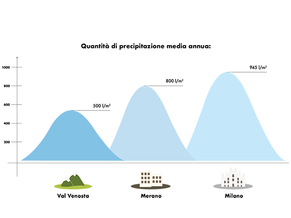 „La poco piovosa Val Venosta, lunga ca. 70 km, è una valle con un orientamento est-ovest. Al nord gli alti massicci montuosi impediscono alle nuvole di pioggia di entrare nella valle, lasciando passare solo il secco e caldo vento di favonio. Da noi in Val Venosta la precipitazione media annuale è di 500 l/m², mentre nella vicina città di Merano, situata a pochi kilometri di distanza, si registra una precipitazione media annua di quasi 800 l/m²”.